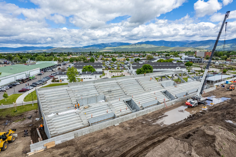 Off-site fabrication of precast elements (risers, podiums, treads, beams, columns) allow simultaneous site prep and concrete component production.